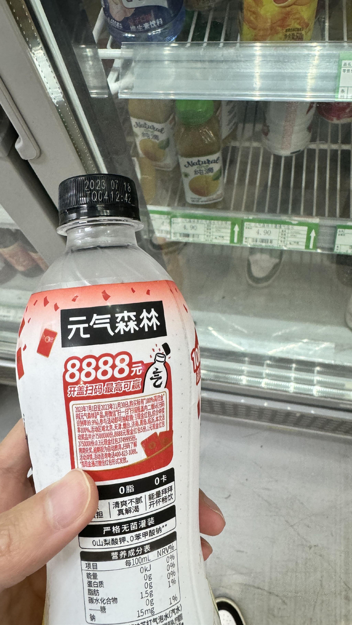 这瓶元气森林的饮料,生产日期2023年7月16日,价格4.9元,并不是临期商品,也不存在什么超低折扣。