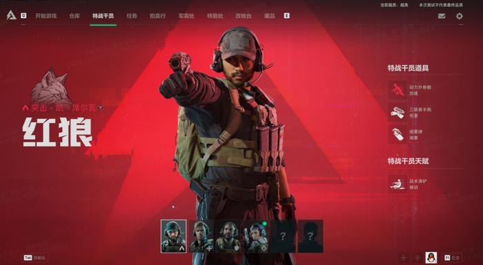 测试版本提供了四位不同定位的干员。突击位的凯自带提升机动性的动力外骨骼,装备有三联装榴弹发射器,以及便于战术滑铲的“钢铁膝盖”;藉由超载外骨骼,还能进一步提升移速和射速。
