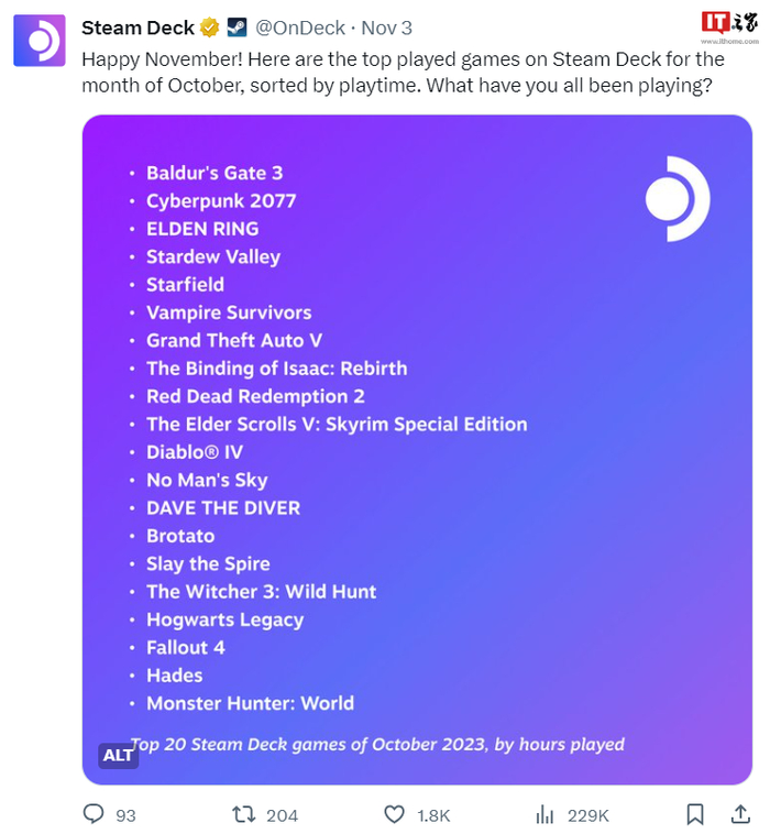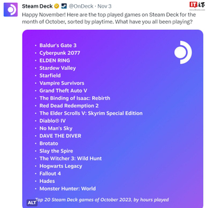 Steam Deck 公布 10 月游戏时长排行:《博德之门 3》《赛博朋克 2077》《艾尔登法环》前三