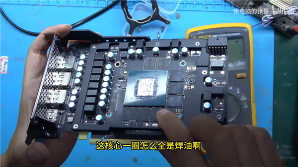 和做手术开膛破肚一样,只见视频中的张哥熟练的拆开显卡散热,检查 PCB 板上的存在的各种毛病。