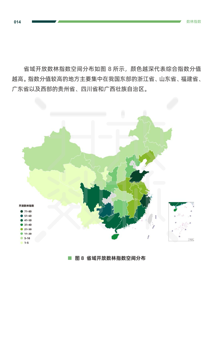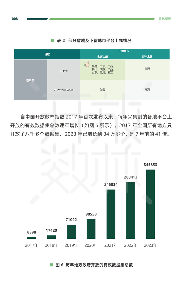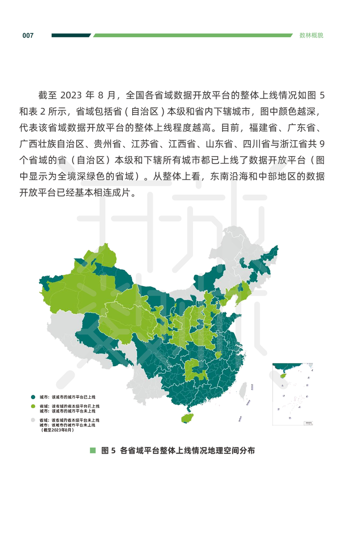 截至 2023 年 8 月,全国各地上线的省级(不含直辖市)公共数据开 放平台的地区分布如图 3 所示,颜色越深,代表平台上线时间越早,整体 上呈现出从东南部地区向中西部、东北部地区不断延伸扩散、相连成片的 趋势。