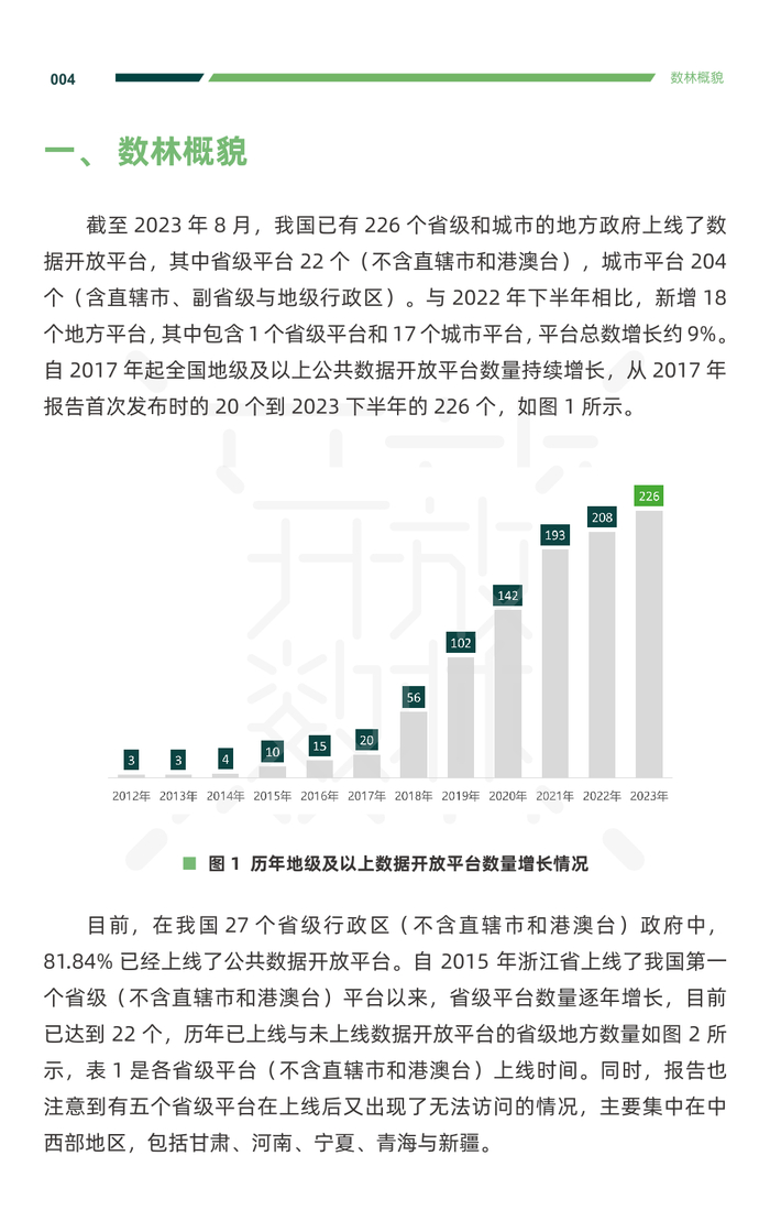截至 2023 年 8 月,我国已有 226 个省级和城市的地方政府上线了数 据开放平台,其中省级平台 22 个(不含直辖市和港澳台),城市平台 204 个(含直辖市、副省级与地级行政区)。与 2022 年下半年相比,新增 18 个地方平台,其中包含 1 个省级平台和 17 个城市平台,平台总数增长约 9%。 自 2017 年起全国地级及以上公共数据开放平台数量持续增长,从 2017 年 报告首次发布时的 20 个到 2023 下半年的 226 个。