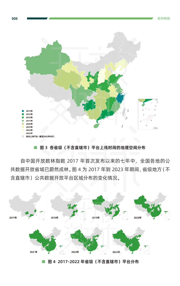 自中国开放数林指数 2017 年首次发布以来的七年中,全国各地的公 共数据开放省域已蔚然成林。图 4 为 2017 年到 2023 年期间,省级地方(不 含直辖市)公共数据开放平台区域分布的变化情况。