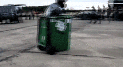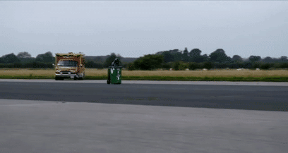 今年工程师Michael Wallhead也进行了这个挑战,速度达到了55mph,他驾驶的是一辆橘色的垃圾桶。