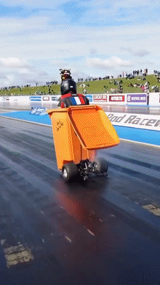 随着拖拉机同款的轰鸣声,垃圾桶也开始在赛道上飞驰了起来,并且不断加速。