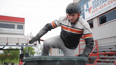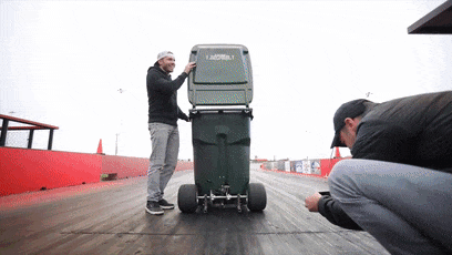 Chris Rollins历经一番折腾,总算是成功把垃圾桶缓缓开到了赛道上,他将会在这里直线加速,然后被记录到最高速度。这一幕还真拍出跑车的感觉了: