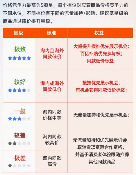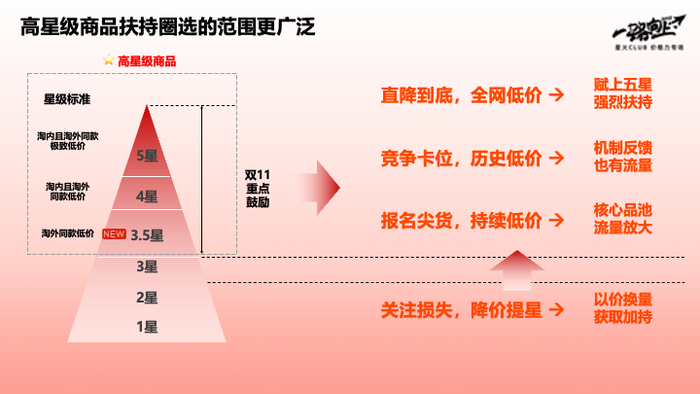 双十一期间,在既有五星价格力星际标准的基础上,除了鼓励全网最低价外,淘宝新增“3.5星机制”,即淘外同款低价商品可赋予3.5星,从而让更多好价商品进入高星级商品池,成为大促的核心供给,获得平台额外流量的助力。