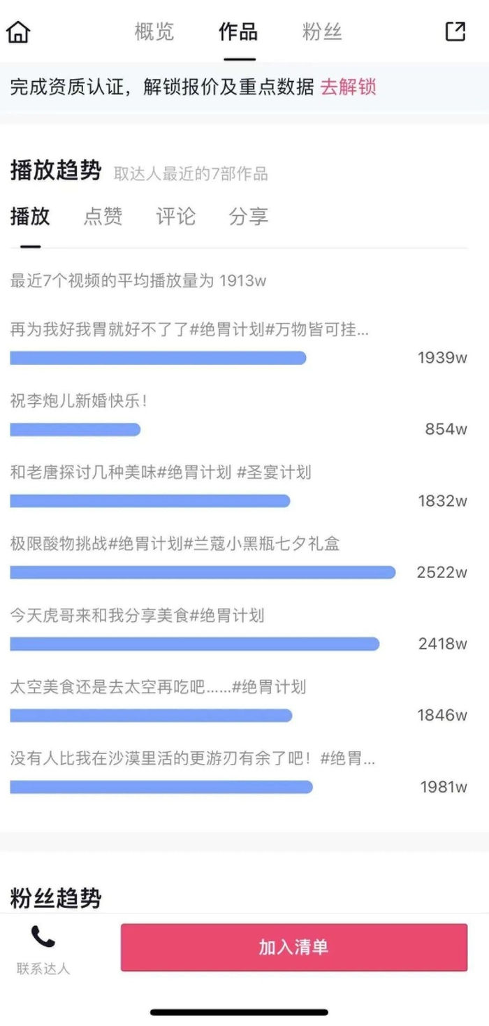 从抖音星图的数据来看,张圣叹的商务作品数据都很不错,平均播放 1913 W,难怪品牌商家们会追着给他“喂饭”。
