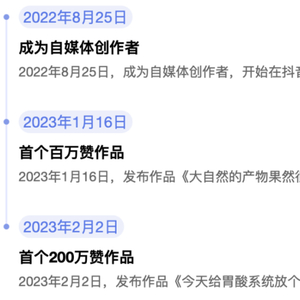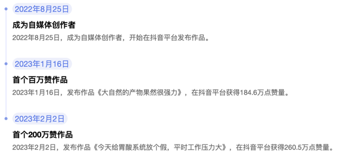 2023 年 1 月 16 日,他收获了第一个百万赞作品《大自然的产物果然很强力》,很快 2 周后他又获得了第一个 200 万点赞的里程碑作品《今天给胃酸系统放个假,平时工作压力大》。