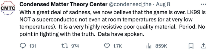 与此同时,美国马里兰大学凝聚态理论中心 CMTC 也表态:「LK-99 不是超导体,即使在室温(或非常低的温度)下也是如此。它是一种电阻非常高的劣质材料。」