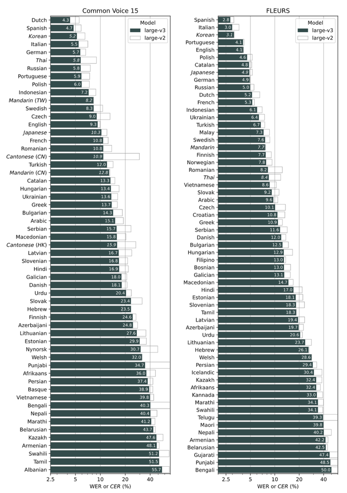 Whisper-V3(也称为 Large-v3)使用了 Large-v2 (Whisper-V2)收集的长达 100 万小时的弱标记音频和 400 万小时的伪标记音频进行训练而成。此外,相比前几代模型,Whisper-V3 在多种语言上显示出了较高的性能改进,下图为 Whisper-V3 在 Common Voice 15 和 Fleurs 上的性能表现: