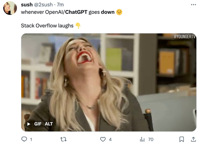 还有网友开玩笑称:「ChatGPT 崩溃了,Stack Overflow 开心了。」