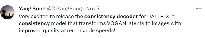 宋飏也证明了网友的猜测,「非常高兴发布 DALL・E 3 的 consistency decoder,这是一种 consistency 模型,可以以惊人的速度将 VQGAN 潜在图像转换为质量更高的图像!」