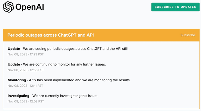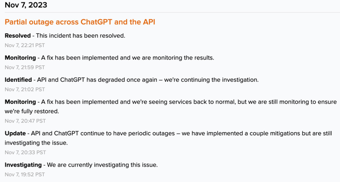 最新状态显示:「ChatGPT 和 API 仍然会出现周期性中断。」