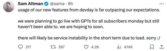 OpenAI CEO Sam Altman 对此次中断表示抱歉,并在推特上说道:「我们在开发者日发布的新功能的使用情况远远超出了预期。我们原计划周一为所有订阅者启用 GPT,但仍未能实现。我们希望尽快。由于负载的原因,短期内可能会出现服务器不稳定的情况。」