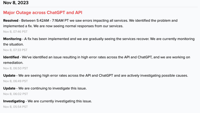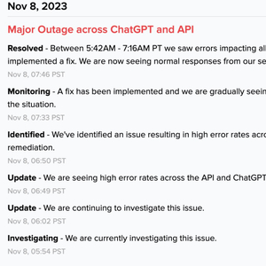 OpenAI 表示这是一次严重的服务器中断,也影响了该公司的 API 服务。