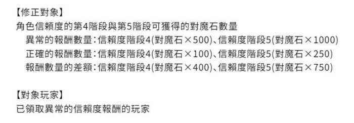 此外,官方没有回收错误发放的对魔石,取而代之的是按照获取的对魔石数量为玩家安排高额债务,比如你已经刷满了两位角色的好感度收获了3000对魔石,那么今后你获得的3000对魔石都将自动用于抵债,贷款还清之后才能正常获取对魔石。
