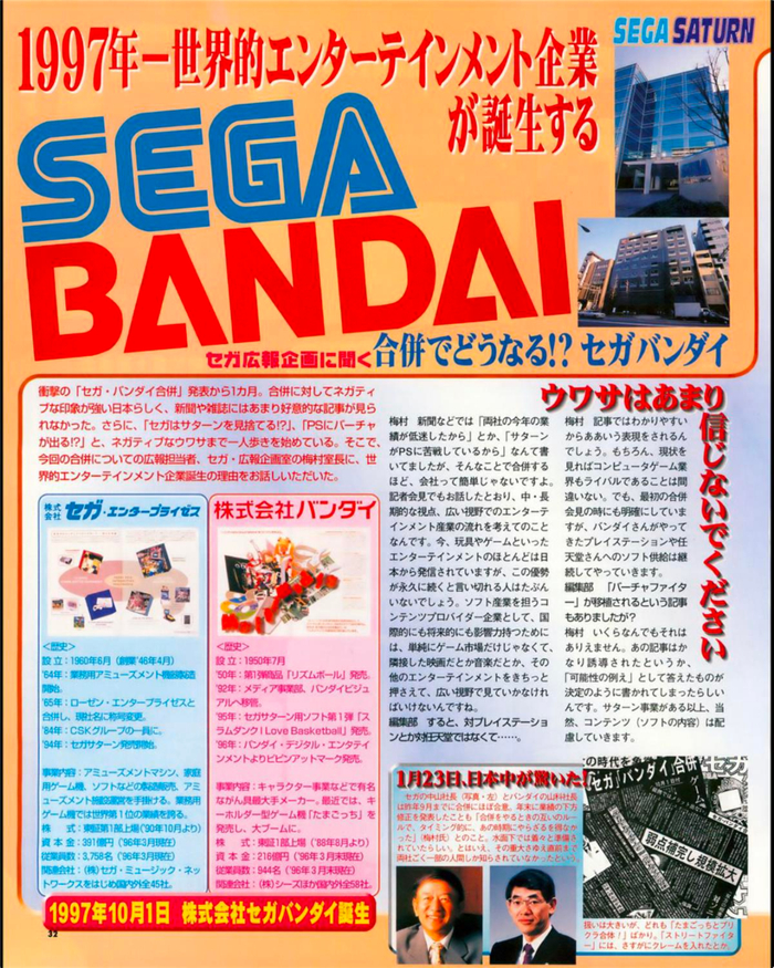 当时的世嘉也深陷次世代大战的泥潭,土星正被索尼PS打得满地找牙。而且世嘉偏重欧美的公司文化也与万代格格不入,所以外界揶揄这次合并是“败者联盟”。