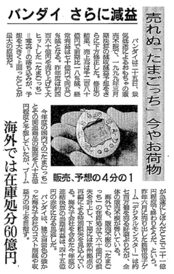 但在热潮迅速褪去后,万代却没有及时修正市场预期,生产了价值85亿日元的商品,结果只卖掉了四分之一。