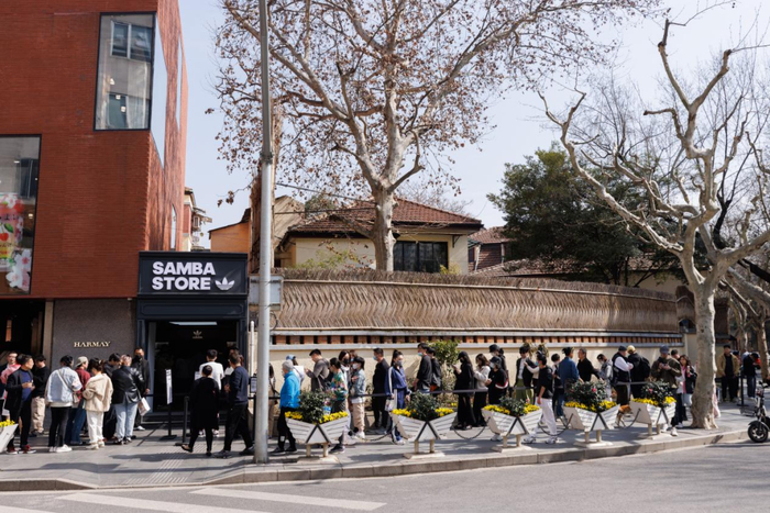 大众的认可度,显而易见。年初在上海举办的SAMBA DAY主题快闪活动现场,久违出现数百人线下排队抢购景象。而海外在线市场Laced数据也显示,阿迪达斯Samba系列鞋款于今年的销售额同比增长超过2000%。