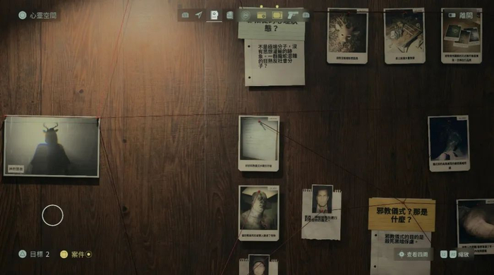就和福尔摩斯等侦探的记忆宫殿一样,玩家能把已获得的线索张贴在证据墙上,通过分类、推理和侧写得到进一步的推论,再加入到证据链里得到答案。