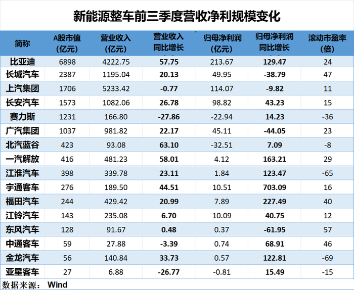 盈利方面来看,《投资者网》统计,16家已披露今年三季报的新能源车企中,12家公司实现归母净利润同比增长,占比超过七成,龙头车企比亚迪净实现净利润213.67亿元,同比增长130%,成为最赚钱的车企。