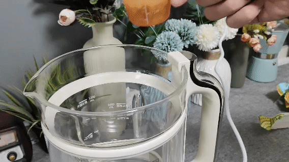 首先,用赠送的自带刻度的量杯将洗净的黄豆装满,之后按官方配比倒入800ml清水后开始制作豆浆。