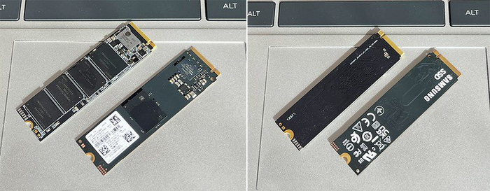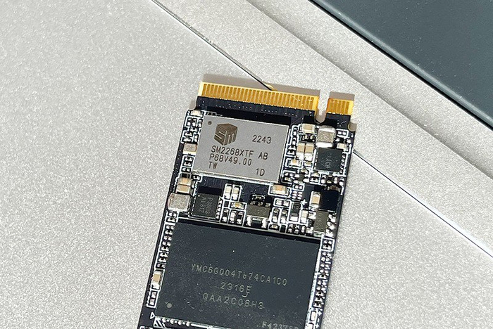 揭开SMI70的标签,能看到正面仅有一颗SM2268XT主控和4颗长江存储的Flash颗粒,并没有配置缓存芯片。同时它与三星原厂SSD均为单面设计,对于笔记升级而言可以进一步降低发热量,同时预留更多散热空间。