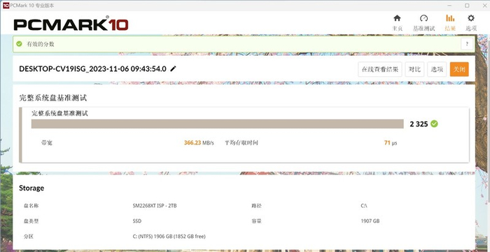 升级SSD以后,再进行完整系统盘测试中,最终得分为2325分,带宽为366.23MB/s,平均存取时间71μs。所以从模拟实际应用表现来看,性能提升还是比较明显的。