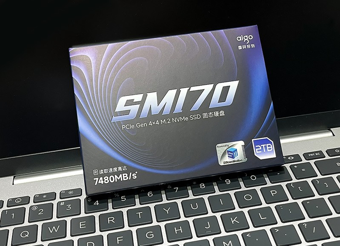 正在犹豫时,看到了aigo发布了一款新品SMI70,它采用的是慧荣SM2268XT主控,属于DRAM-less无缓存模式架构,宣称读写速度可以达到7480MB/s和6700MB/s,直接击碎了有的人说无缓存SSD性能差的说法,加上双十一首发价仅849元,所以笔者就直接入手了。
