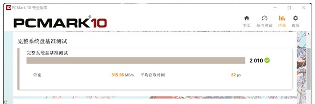 上图是原装三星SSD在PCMARK10中完整系统盘基准测试中的分值,得分为2010分。