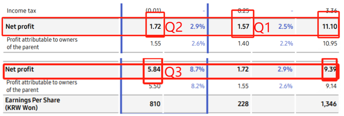 在刚刚结束的进博会上,第六次参展的三星公司,又一次凭借折叠屏手机、MICRO LED以及3nm芯片等前沿科技产品,吸引了无数观众注目。然而,在极力推销自家产品和业务布局的同时,近一年来三星公司的各业务的业绩并不乐观。据三星电子新近发布财报,三季度,三星电子营业利润同比减少77.57%,下跌幅度远超以往。而在今年上半年,受半导体行业低迷影响,三星电子前两季度净利润同比下跌均超过84%,创近14年来最大跌幅。与此同时,继三星手机宣布退出中国市场后,网传三星在华的显示器工厂将搬迁。在进博会现场,在提及三星电视显示器产地时,三星现场工作人员透露,“显示屏业务已经不是在华生产,产能已转至越南。”但在随后的追问中,相关人员又急忙声称,“并不清楚产线具体情况”。渴望对外展示却又遮遮掩掩的三星公司,究竟在顾虑着什么?9个月亏损714亿元,创近14年最大下跌近日,三星旗下最大子公司三星电子公布2023年Q3财报。财报显示,三季度,三星电子营业利润2.43万亿韩元,同比减少77.60%;销售额67.40万亿韩元,同比下滑12.21%;净利润5.84万亿韩元,较上一年同期净利润9.39万亿韩元同比减少37.80%。这不是三星电子本年度净利润下滑最为严重的一个季度,今年第一,第二季度,三星电子的净利润下滑程度更为严重。其中,第二季度三星电子净利润1.72万亿韩元,较上年同比下滑84.50%;第一季度,三星电子净利润1.57万亿韩元,较上一年同期同比下滑86.13%。