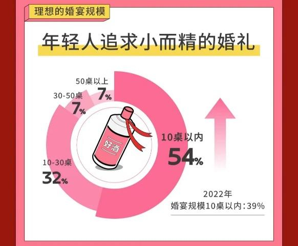 通过抽样调查、数据分析等方式深入调研,《报告》发现,在所有受访者中,选择举办婚礼的人与2022年相比明显提升,男性更是上涨近10%。同时,《报告》也显示,年轻人期待的婚礼规模更趋轻量化,婚宴规模10桌以内成为首选,并且他们更加注重个性化需求。