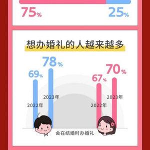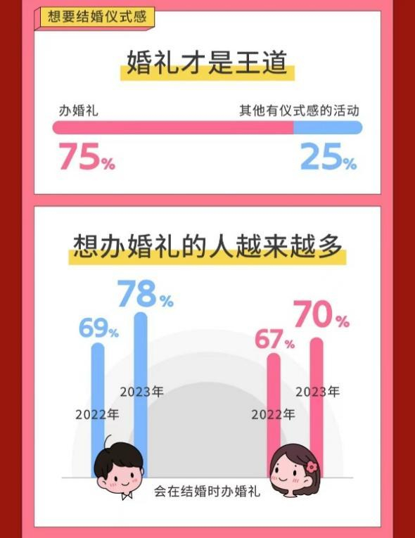 不难看出,这届年轻人依然对婚礼抱有强烈期待。举办带有“仪式感”的婚礼不仅依然是年轻人的主流选择,而且比重还有所上升。本次《报告》的数据表明,在有结婚打算的未婚青年中,78%的男性和70%的女性都表示会在结婚时办婚礼。与2022年相比,选择举办婚礼的占比明显提升,男性占比更是上涨近10%,由此来看,受疫情影响而被减弱的婚礼需求正在逐步恢复。