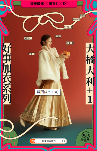 双11期间,淘宝也作为支持方参与了“西塘汉服节”的相关活动。在汉服节上,淘宝服饰总经理看山表示,淘宝服饰一直伴随着汉服文化的复兴,从汉服到新中式,越来越多的原创品牌在这里发荣滋长。随着华服日常化成为一种新趋势,未来必定会有更多单品服装像旗袍、马面裙一样流行起来,成为经典。