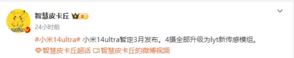 【手机中国新闻】目前,网上关于小米14 Ultra的爆料信息越来越多,这也意外着该机即将与消费者见面。11月15日,手机中国注意到,有数码博主爆料,小米14 Ultra暂定明年3月份发布,四摄全部升级为索尼LYT新传感模组。