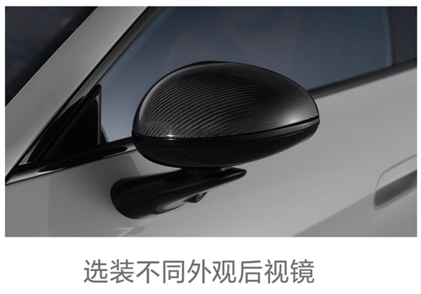 不仅如此,它的后视镜甚至有个碳纤维的选装版本,能轻多少先不说,视觉马力起码能加 5 匹。