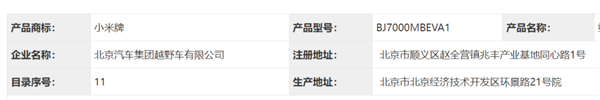 这次申报小米汽车的企业是北京汽车集团越野车有限公司,它是北汽集团下面的子公司。