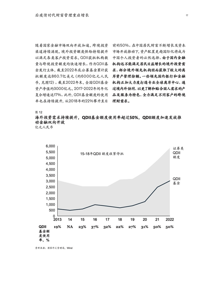 一方面富裕及高净值客户的离岸金融投资规模从2013年的4.8万亿提升至2022年的13.1万亿元;另一方面作为在岸境外投资的重要通道,QDII额度从2013年的3000亿提升至2022年的6000亿元,额度使用率从19%提升至50%。一些领先金融机构正大力打造离岸中心、提升跨境客户服务能力。