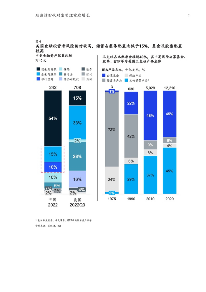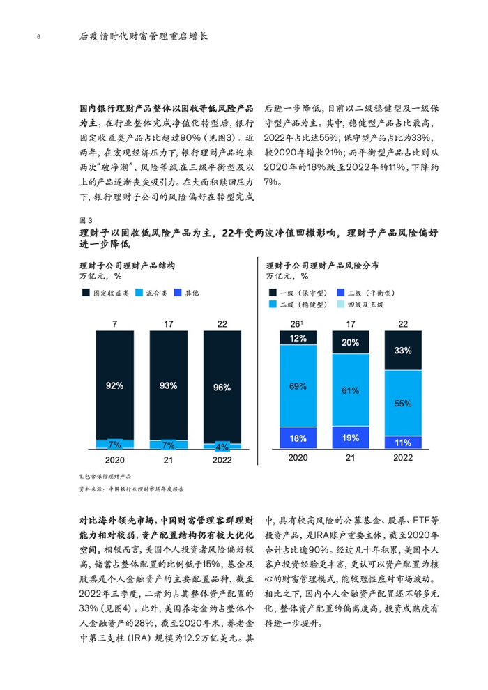 过去10年权益类等中高风险投资产品增速约为20% 。虽然2022年受宏观和资本市场波动影响,出现向储蓄的短期回流,但我们认为中国投资者选择向较高风险投资产品迁移的趋势仍将持续。