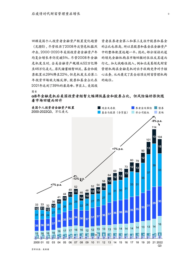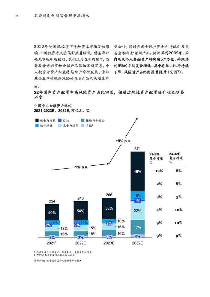 2013-2022年中国财富管理市场以每年13%的高速增长,奠定了如今的市场规模;未来十年预计个人金融资产仍将持续保持9% 的年复合增长率,财富管理业务仍是值得金融机构战略聚焦的蓝海市场。