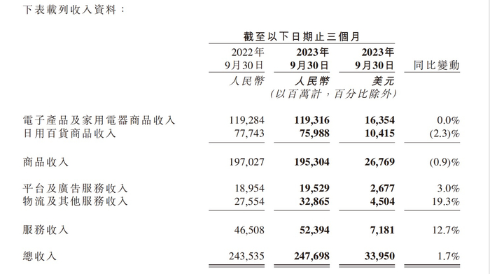 收入构成上,第三季度,京东商品收入达1953亿元,同比减少0.9%。其中电子产品及家用电器商品收入为1193亿元,与去年同期相比持平;日用百货商品收入同比下降2.3%。服务收入达到524亿元,占整体收入的比例首次超过20%、达到21.2%,创历史新高。其中平台及广告服务收入同比增长3.0%,物流及其他服务收入同比增长19.3%。