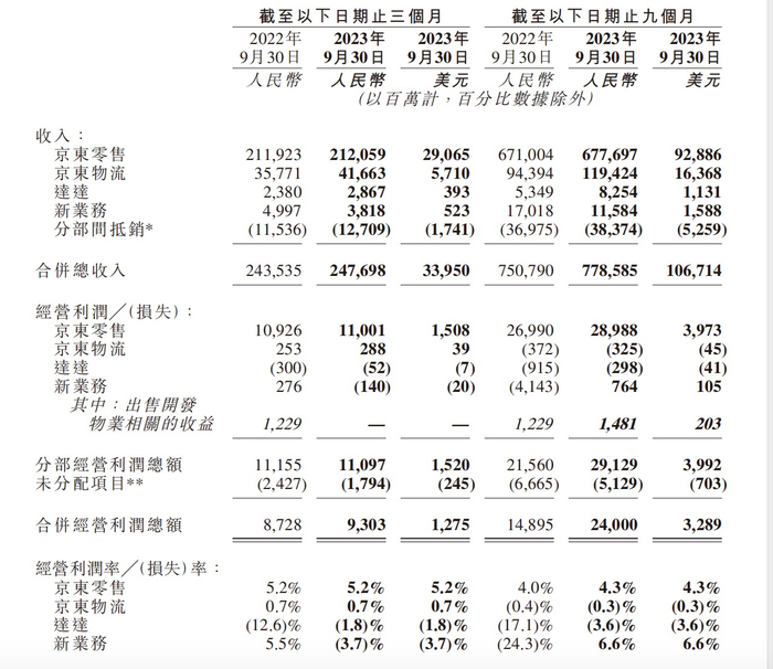 数据显示,京东三季度收入达到2477亿元(人民币,下同),同比增长1.7%。京东集团在非美国通用会计准则下归属于上市公司普通股股东的净利润为106亿元;在非美国通用会计准则下归属于上市公司普通股股东的净利润率为4.3%,零售经营利润率为5.2%。