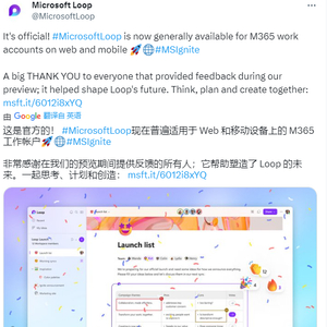 IT之家 11 月 16 日消息,在今天的 Ignite 2023 开发者大会上,微软宣布 Microsoft Loop 正式向所有用户开放,所有 Microsoft 365 用户都可以在 Web 和移动设备上查看。