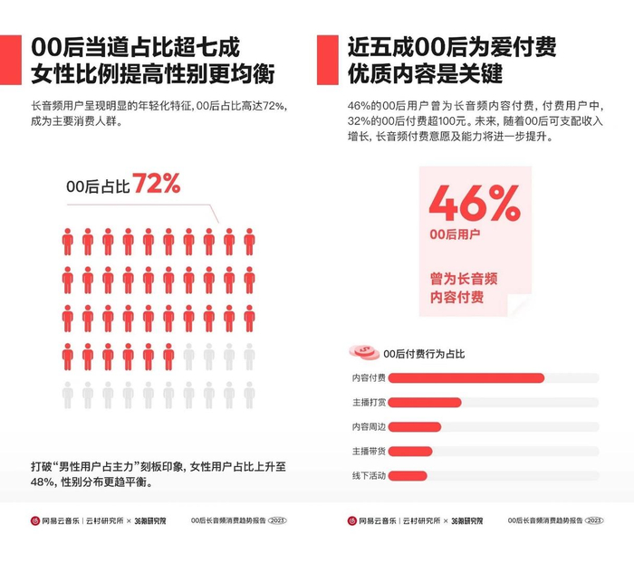 8月,网易云音乐联合36氪研究院,共同发布《00后长音频消费趋势报告(2023)》,报告指出,长音频用户呈现明显的年轻化特征,00后占比高达72%;近五成00后用户曾为长音频内容付费,IOT将成为当前00后收听长音频内容的重要渠道。