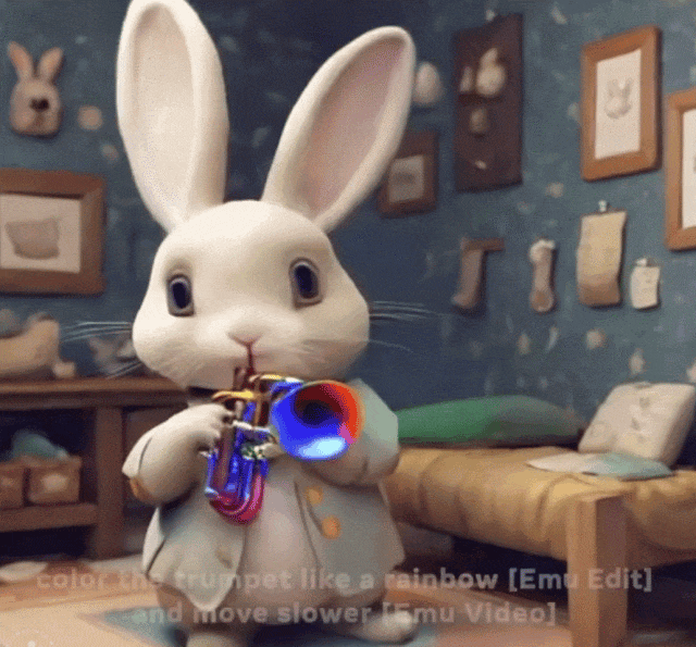 这个「吹小号、跳舞的兔子」是 Meta 发布的最新 demo。从中可以看出,Meta 的技术既支持灵活的图像编辑(例如把「兔子」变成「吹小号的兔子」,再变成「吹彩虹色小号的兔子」),也支持根据文本和图像生成高分辨率视频(例如让「吹小号的兔子」欢快地跳舞)。