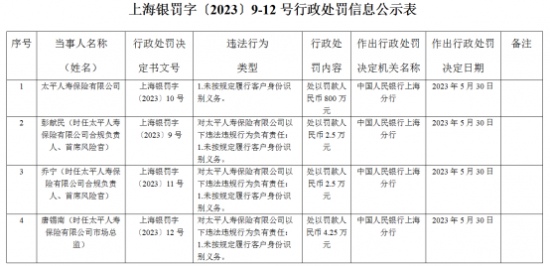 值得注意的是,今年5月30日,中国人民银行上海分行发布了上海银罚字〔2023〕9-12号行政处罚,太平人寿保险涉及4项处罚。太平人寿保险因未按规定履行客户身份识别义务被中国人民银行上海分行处以800万元罚款。
