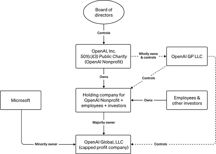 OpenAI的架构较为复杂。据其官网显示,作为一家最初愿景为非营利性的组织,尽管在此后微软多轮注资后开始尝试部分营利性活动,但是公司表示,OpenAI营利性子公司OpenAI Global完全由OpenAI非营利组织控制。即虽然OpenAI Global“被允许寻求和分配利润”,但其受非营利组织使命的约束。