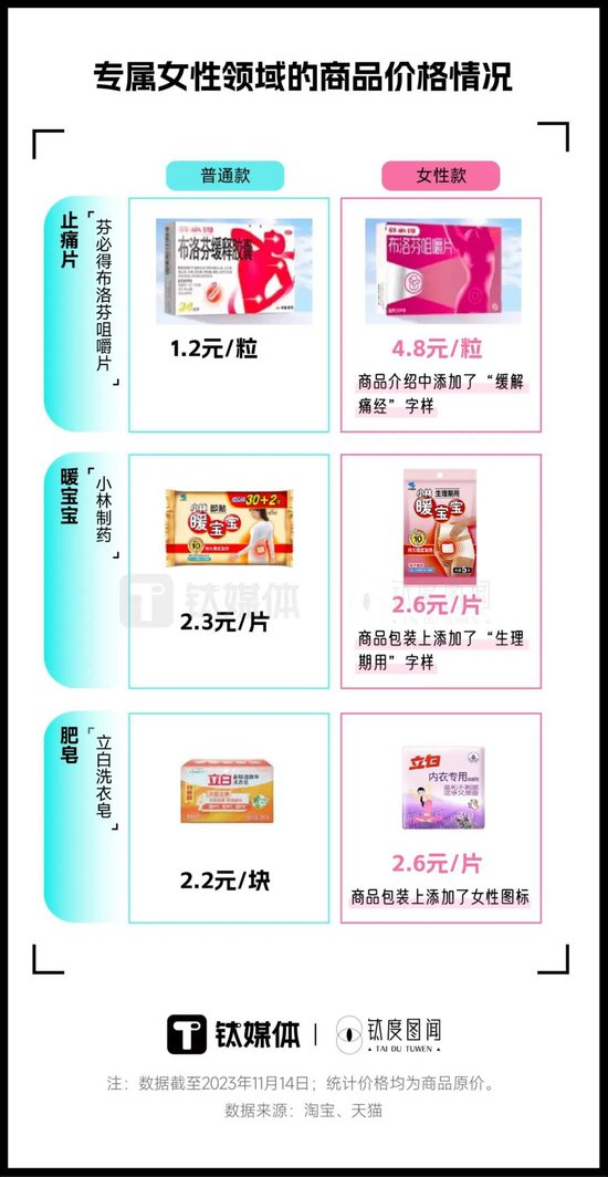 在药品中,你也可以发现“粉红税”的现象。同一品牌相同成分的止痛药,粉色包装、介绍中添加了“痛经专用”字样的小粉片价格更高,一粒药片的价差为3.6元左右。