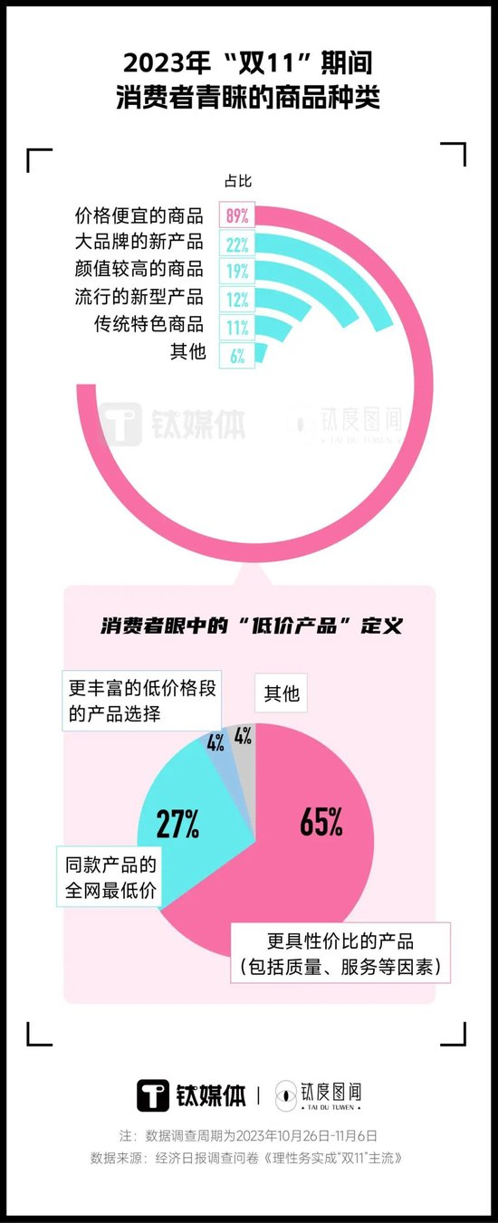 在今年“双11”中,调查显示,89%的消费者青睐便宜的商品。在进行消费决策时,越来越多的消费者会思考某一商品究竟是不是自己真正需要的,深思熟虑后再下单已是常态。而对于“低价产品”的定义,65%的消费者认为不应只是价格低,还要有更高的质量和更优的服务。